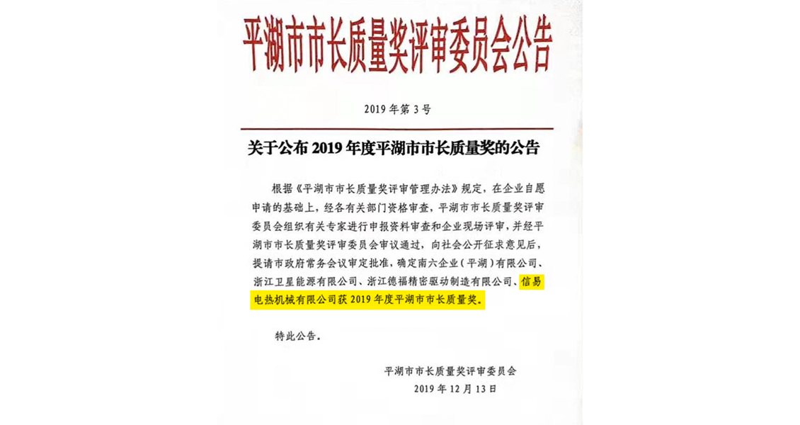[Shini Group] Pinghu Shini Won the Pinghu Mayor Quality Award of Jiangzhe Province