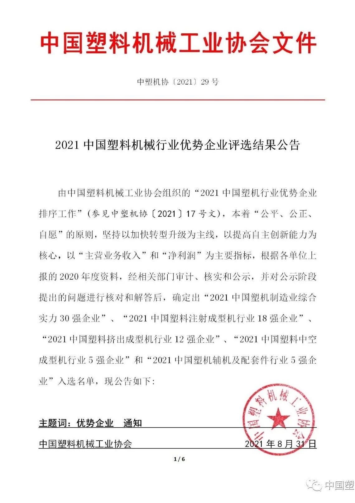 The "Ranking of Preponderant Enterprises in China's Plastic Machinery Industry of 2021" (See CPMIA Document [2021] No.7) organized by China Plastic Machine Industry Association is based on the "Fair, Justice and Voluntary" principle, which takes the "Main Business Income in 2020" and "Net Profit in 2020" as the leading economic indicators for the ranking. According to the data of 2020, Shini Group has been classified into Top 5 Enterprises of 2021 in China's Plastic Auxiliary Machinery and Accessory Industry.