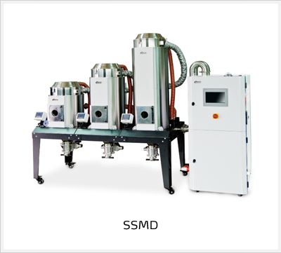 Smart Modular Dryer SSMD consists of a rotary dehumidifier and three sets of modular drying hoppers. Those hoppers are set on the floor stand which is modularized assembly. The drying air comes out from the outlet of the rotary dehumidifier and goes out through the main pipe. Then, the drying air is sent to different drying hoppers via. the branches of the main pipe. After finishing drying, hot air will come out from the air exhaust outlet and then go back to the air return pipe. At last, it will go back to the rotary dehumidifier. During this process, this machine is capable of auto adjustment and allocation. There is an air flow transmitter and air regulator at each branch pipe which enters into drying hoppers. The air flow transmitter is for detecting air capacity changes and sends the related information to the central control unit which controls the air regulator to realize auto adjustment and allocation.