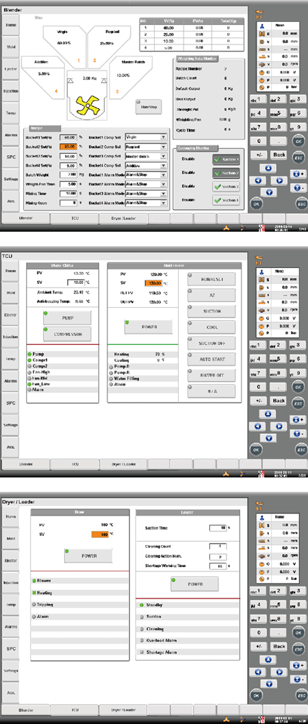 The demonstration system we display in this exhibition consists of the control panel of the molding machine and controllers of the auxiliary equipments. In this system, the control panel of the molding machine is the main control unit while the other five controllers of different auxiliary equipments are the branch control units. Therefore, the molding machine is able to centrally control different types of auxiliary equipments.
