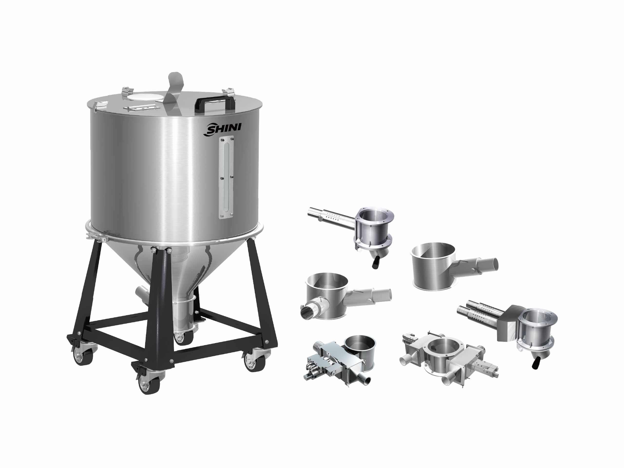 Mainly used for material storage, placed beside material room or IMM; Works with granulator to convey regrind material, ensuring instant reuse of recycled material.