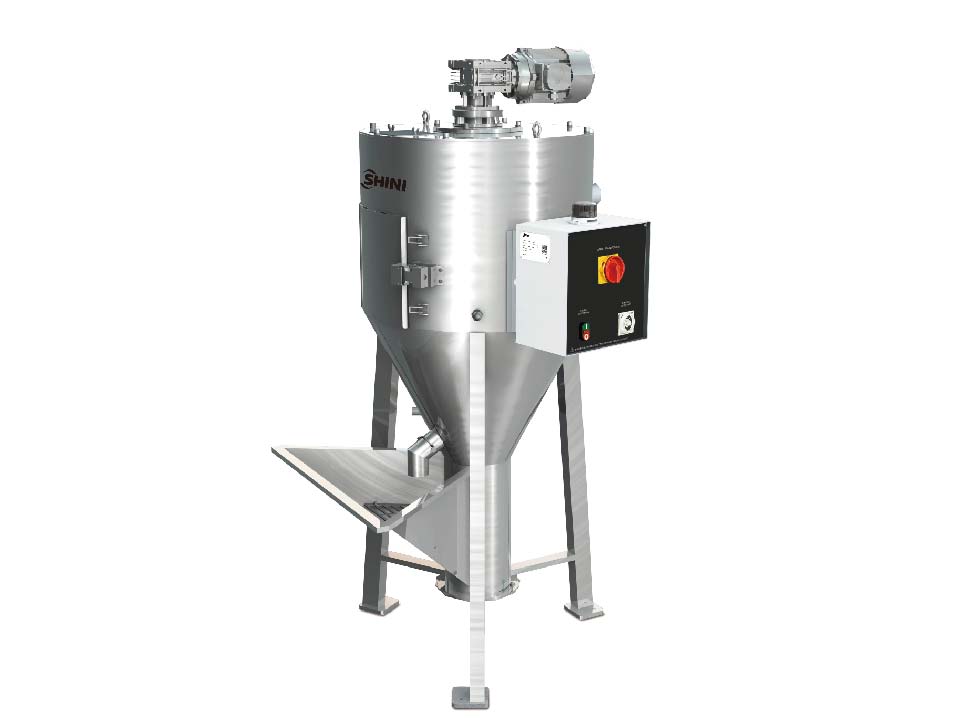 - Vertically mounted blending screw and cylinder ensure even mixing of materials.