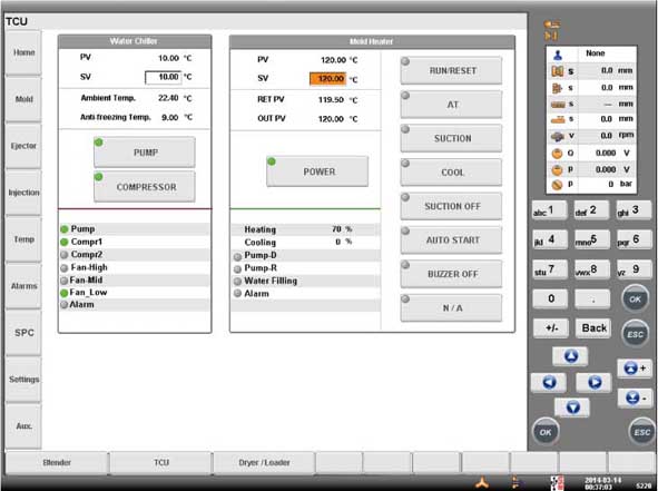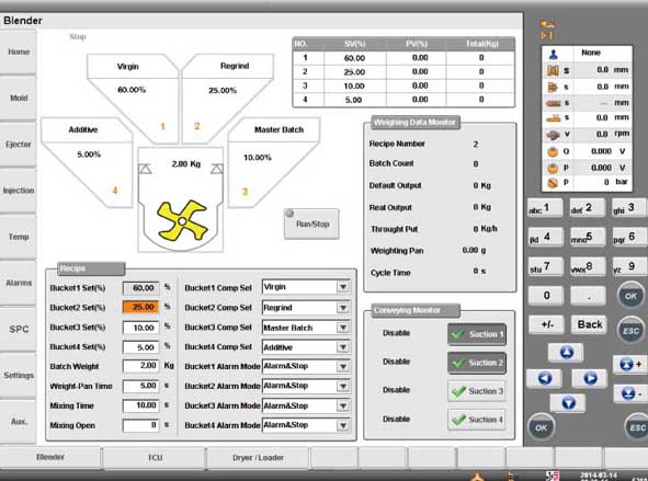 The system possesses control function of both injection molding machine and auxiliary equipment. Integrate the monitor functions of auxiliary equipment,like dehumidifying dryer,gravimetric blender, water chiller and mold temperature controller etc. into the control system of the injection molding machine, which realize to monitor the working state of the injection molding machine and each auxiliary equipment via the touch screen on the injection molding machine. Therefore, it can improve operation efficiency and device maintenance.