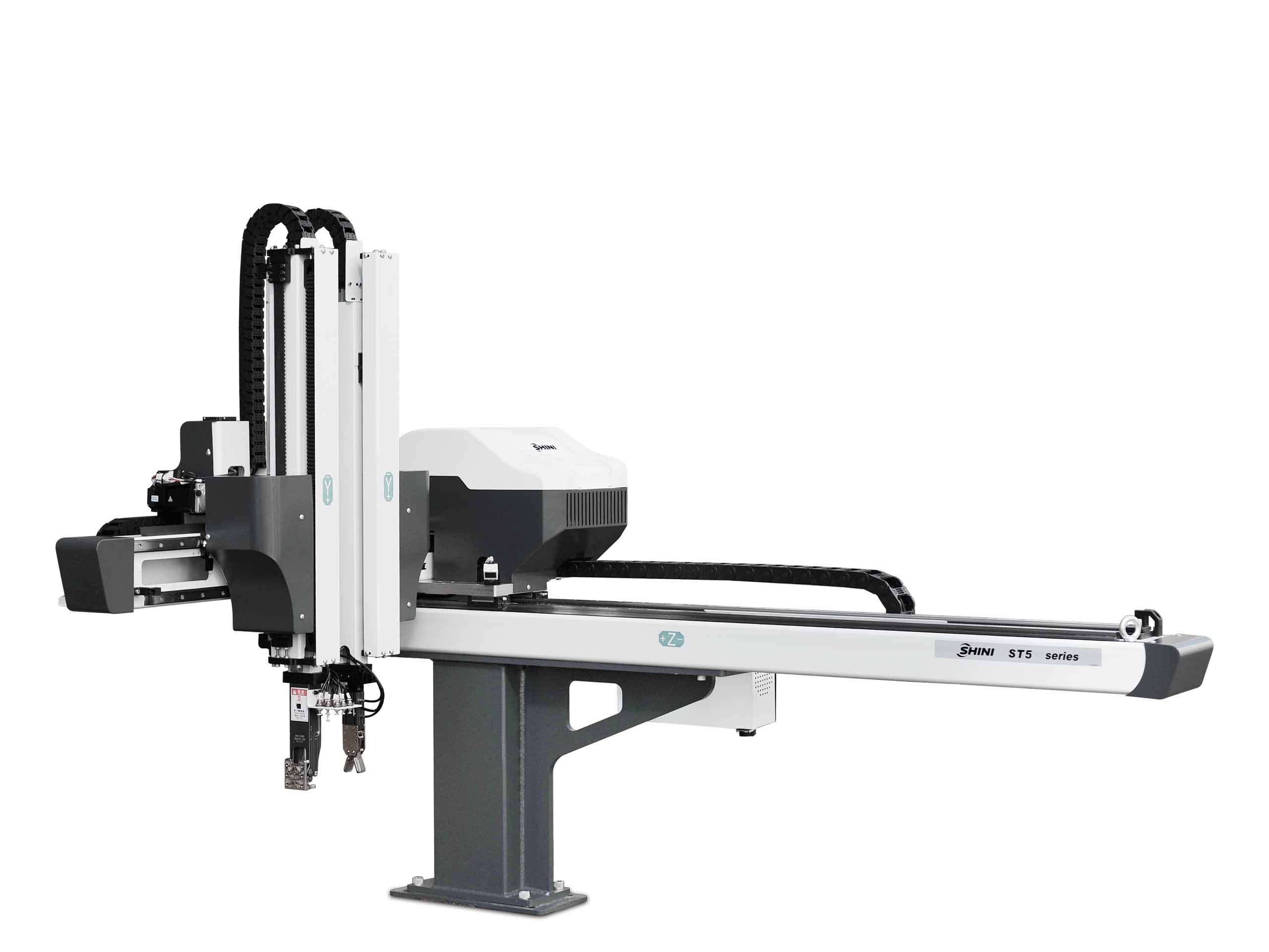 The ST5-S series robot is designed for rapid and precise removal of products from injection molding machine, and place them at desired locations. Standard and telescopic arm(s) are selectable to cooperate with 2-plate mold or hot runner system, Gantry Robot. Capable of arranging, stacking, quality checking and in mold placement. Suitable for injection molding machine under 300T clamp force.