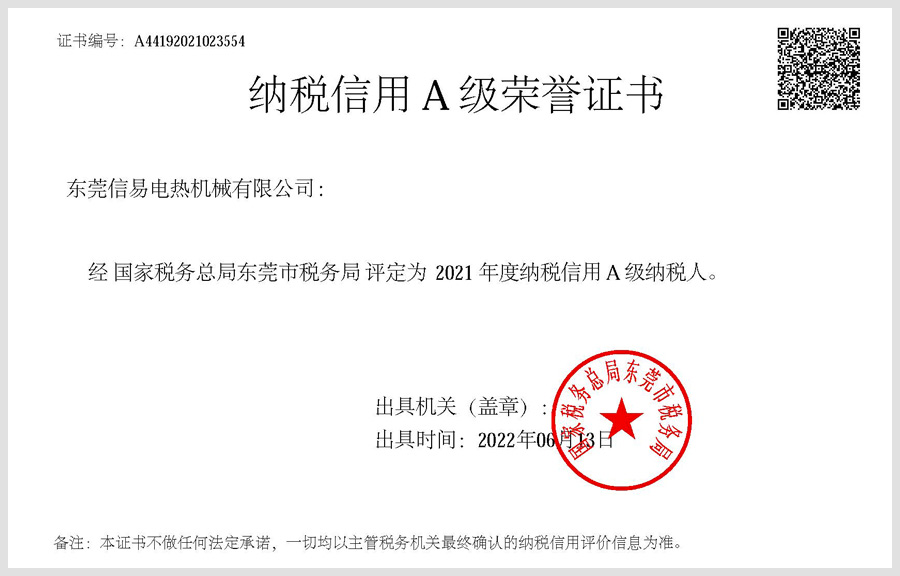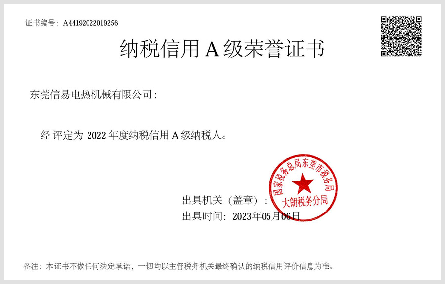 东莞信易电热机械有限公司连续三年(2020~2023)均经 国家税务总局东莞市税务局 评定为 “纳税信用 A 级纳税人”,该评级是纳税人依法履行纳税义务,并被社会所普遍认可的一种信用评级,是社会信用体系建设重要内容之一,同时也是相关行政执法部门对企业在税务及财务管理方面的高度认可。