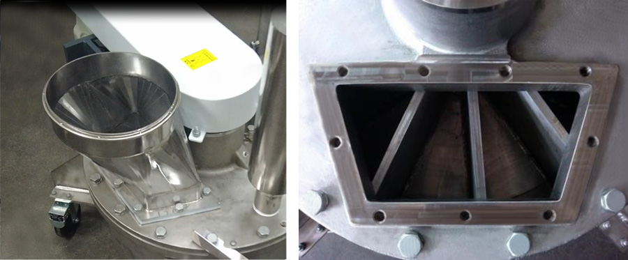 原料入料口与原料排出口皆为V型,能降低因颗粒咬料而导致原料破碎的情况。应用在PET颗粒的场合时,假设本体入口和旋转体形状都为直形的咬料率为100%,旋转体形状呈V型时咬料率会降低为50%。那么,当原料入料口和原料排出口皆为V形时,咬料率比仅旋转体为V型时还要降低约1/3。