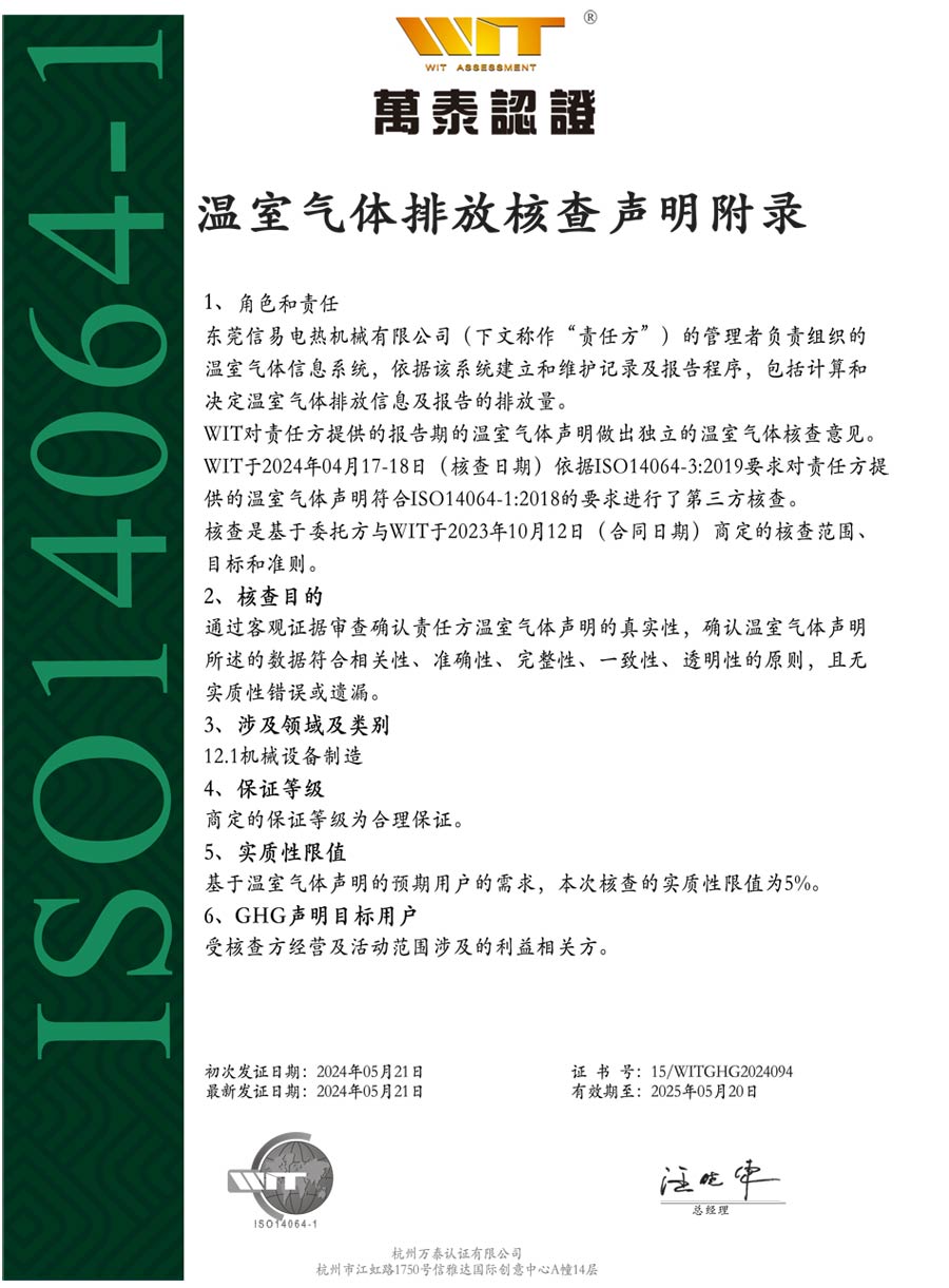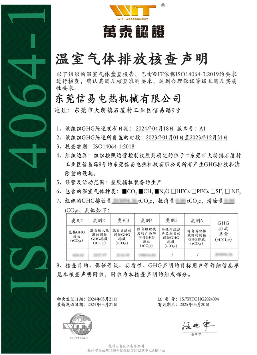 信易集团作为塑胶辅机装备制造领军企业,控制和减少温室气体排放是一项义不容辞的社会责任。为了更好推动双碳工作,公司要求全员参与温室气体盘查,对各项排放源进行温室气体排放核算,每项指标均要求认真落实。并基于温室气体数据发现能源消耗和成本的现状采取相应的节能减排措施,降低能源消耗和成本,提升企业核心竞争力,实施可持续发展战略。为了保证盘查数据的准确性及透明性,公司聘请权威第三方认证机构万泰认证进行核查,在公司全员的共同努力下,顺利通过国际ISO14064认证。