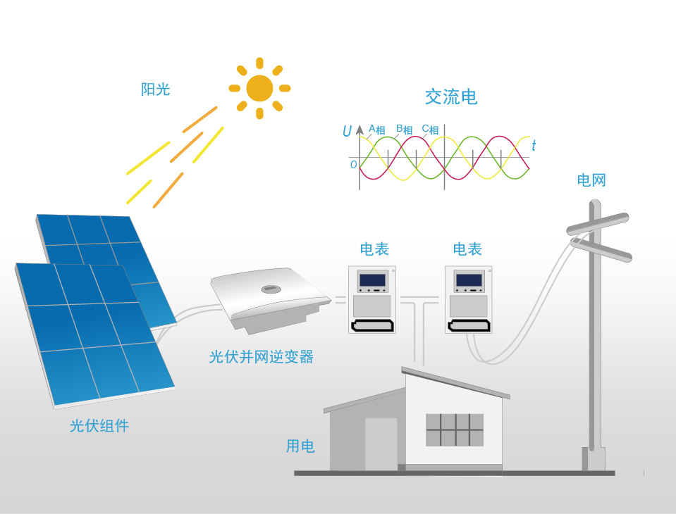 其系統主要由太陽能電池板(光伏組件)、並網逆變器和控制系統三大部分組成。