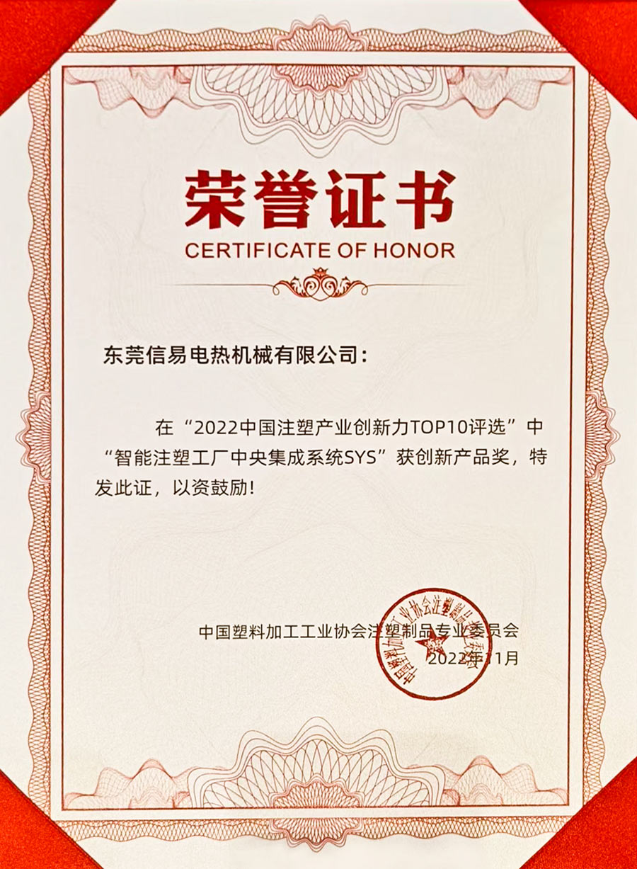 近日,信易系統化方案“智能注塑工廠中央集成系統SYS”經中國塑膠加工工業協會注塑製品專業委員會(以下簡稱中國塑協注委會)組織評選,在“2022中國注塑產業創新力TOP10”評選活動中喜獲創新產品獎。