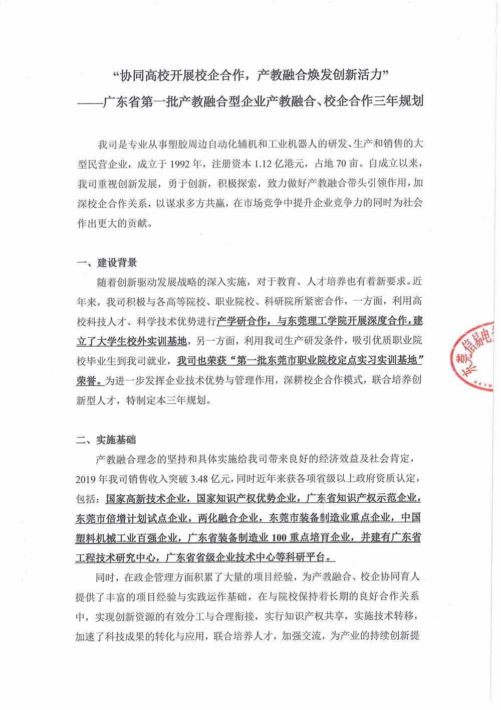 隨著創新驅動發展戰略的深入實施、對於教育、人才培養也有著新要求。近年來,我司積極與各高校、職業院校、科研院所緊密合作,一方面,利用高科技人才、科學技術優勢進行產學研合作,與東莞理工學院開展深度合作,建立了大學生校外實訓基地,另一方面,利用我司生產研發條件,吸引優質職業院校畢業生到我司就業,我司也榮獲“第一批東莞市職業院校定點實習實訓基地”榮譽。為進一步發展企業技術優勢與管理作用,深耕校企合作模式,聯合培養創新型人才,特定制本三年規劃。